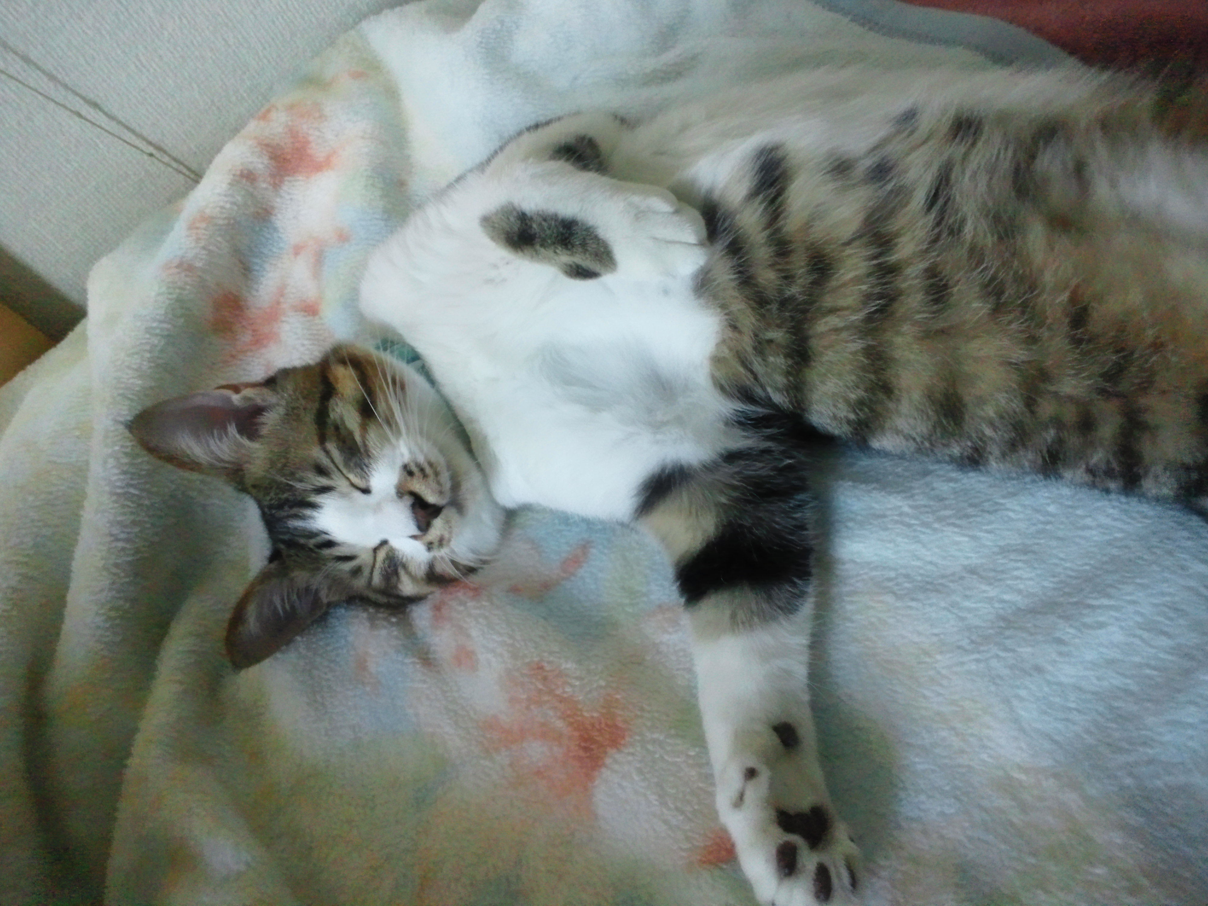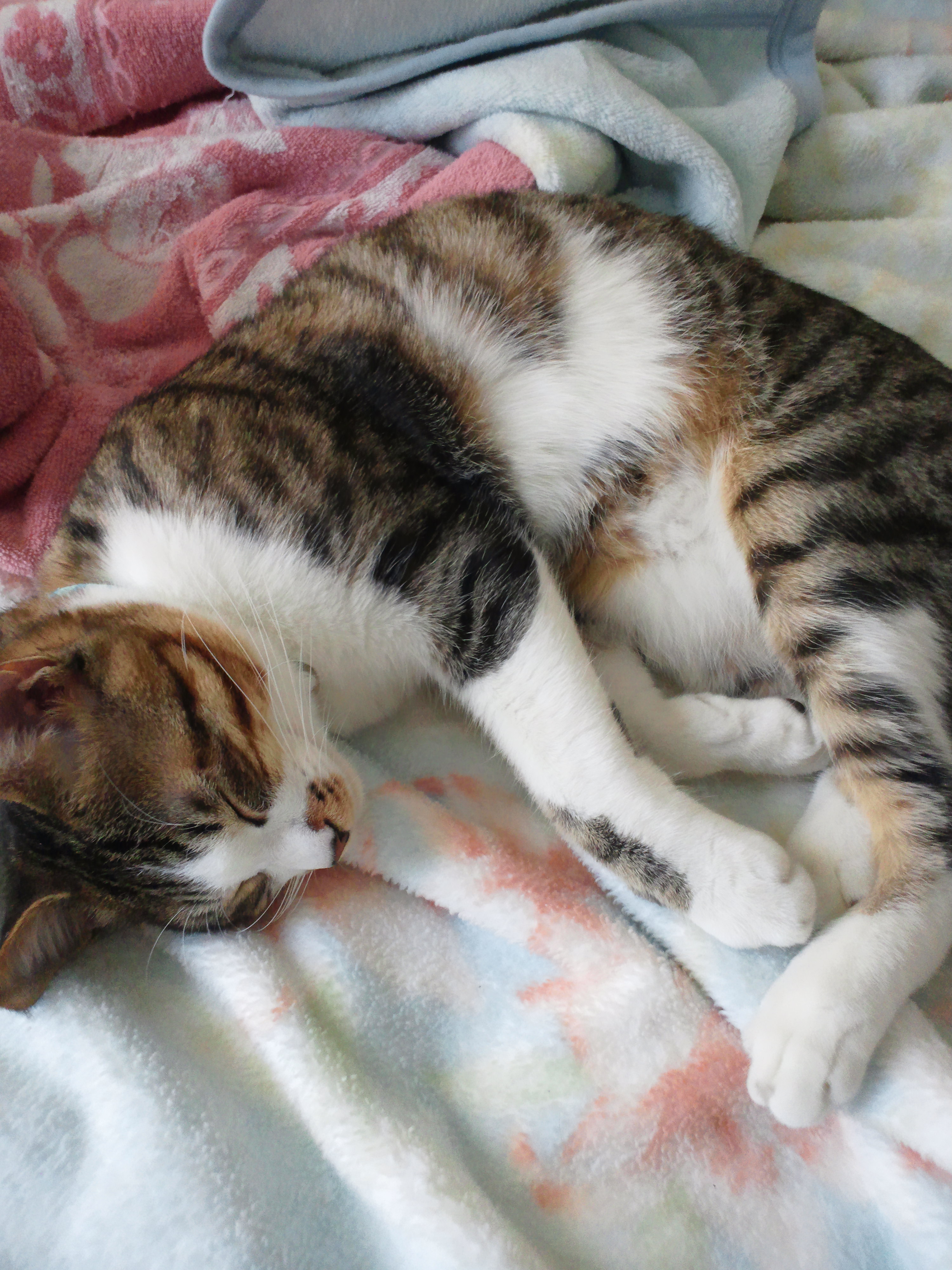 文ちゃんの為に毛布を買った。と言っても、お茶のオマケのブランケットだが。文ちゃんは満足げに乗って寝ていました。。
